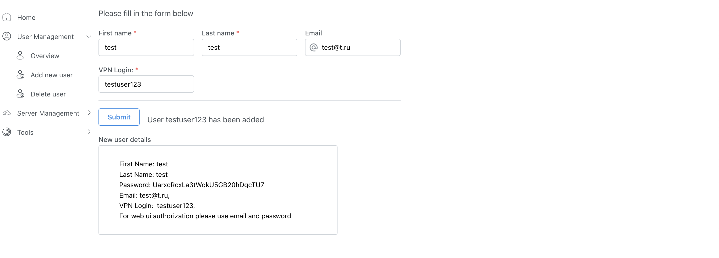 После заполнения всех обязательных полей требуется нажать кнопку “Submit” и дождаться завершения создания пользователя.