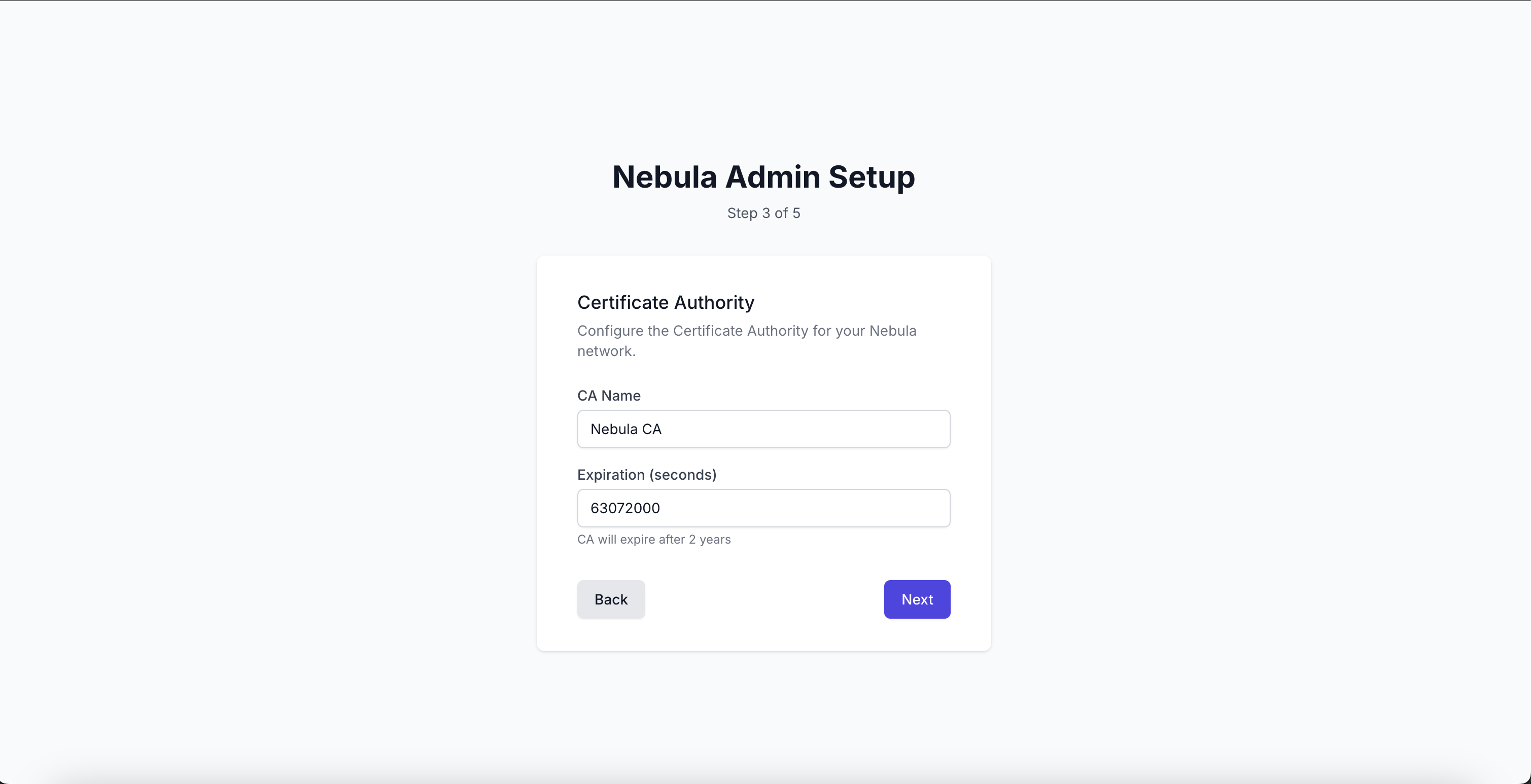 На следующем экране Вам предложат задать имя для CA сертификата и срок его действия, вы можете оставить все как есть