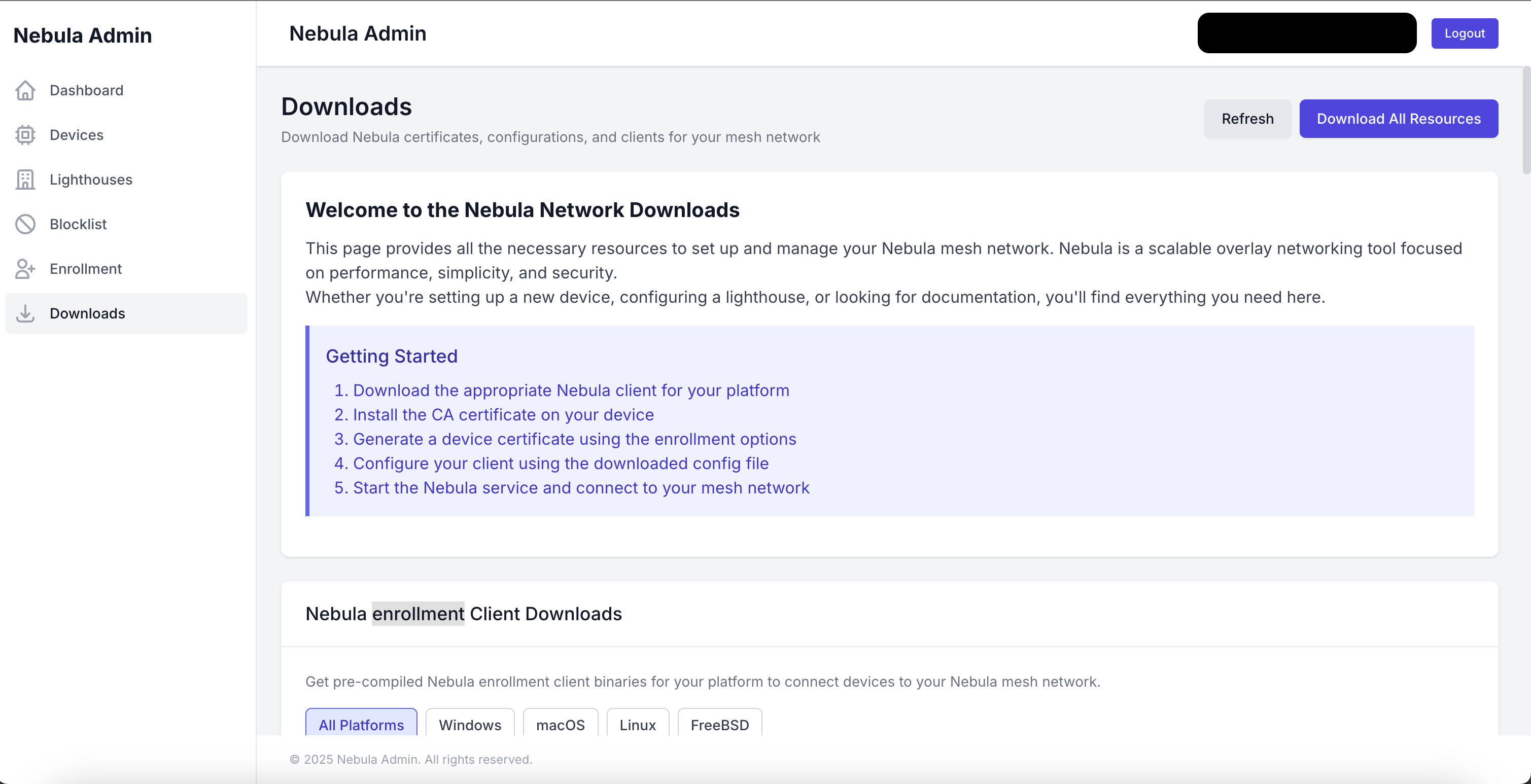 Скачайте и распакуйте nebula-client, клиент облегчит процесс настройки вашего узла сети.